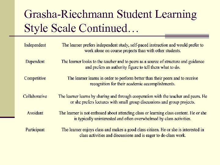 Grasha-Riechmann Student Learning Style Scale Continued…