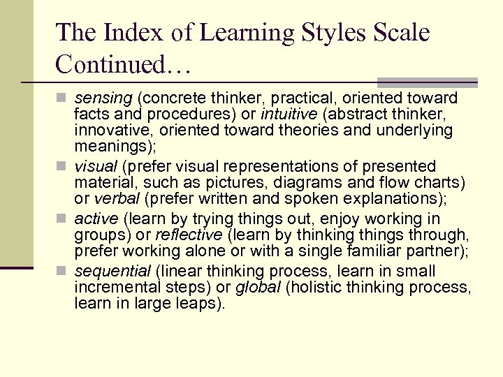 The Index of Learning Styles Scale Continued… n sensing (concrete thinker, practical, oriented toward facts and procedures) or intuitive (abstract thinker, innovative, oriented toward theories and underlying meanings); n visual (prefer visual representations of presented material, such as pictures, diagrams and flow charts) or verbal (prefer written and spoken explanations); n active (learn by trying things out, enjoy working in groups) or reflective (learn by thinking things through, prefer working alone or with a single familiar partner); n sequential (linear thinking process, learn in small incremental steps) or global (holistic thinking process, learn in large leaps).