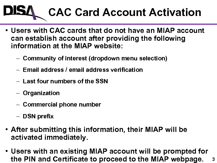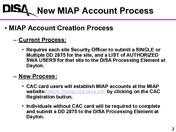 New MIAP Account Process • MIAP Account Creation Process – Current Process: • Requires each site Security Officer to submit a SINGLE or Multiple DD 2875 for the site, and a LIST of AUTHORIZED SWA USERS for that site to the DISA Processing Element at Dayton. – New Process: • CAC card users will establish MIAP accounts at the MIAP website: https: //miap. csd. disa. mil/ by clicking on the CAC Registration button. • Individuals without CAC card will be required to complete and submit a DD 2875 to the DISA Processing Element at Dayton. 2