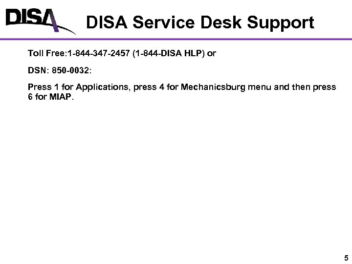 DISA Service Desk Support Toll Free: 1 -844 -347 -2457 (1 -844 -DISA HLP) or DSN: 850 -0032: Press 1 for Applications, press 4 for Mechanicsburg menu and then press 6 for MIAP. 5
