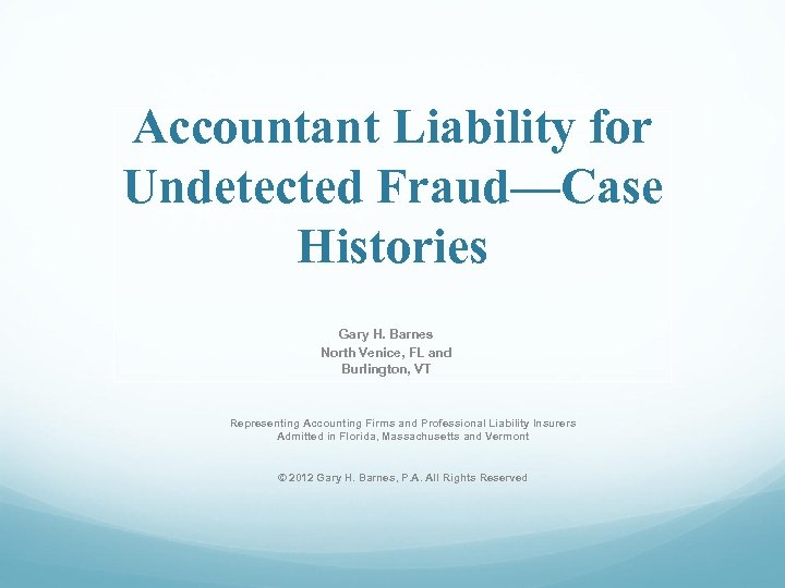 Accountant Liability for Undetected Fraud—Case Histories Gary H. Barnes North Venice, FL and Burlington, VT Representing Accounting Firms and Professional Liability Insurers Admitted in Florida, Massachusetts and Vermont © 2012 Gary H. Barnes, P. A. All Rights Reserved