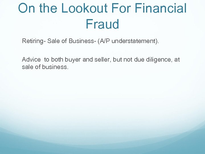 On the Lookout For Financial Fraud Retiring- Sale of Business- (A/P understatement). Advice to both buyer and seller, but not due diligence, at sale of business.