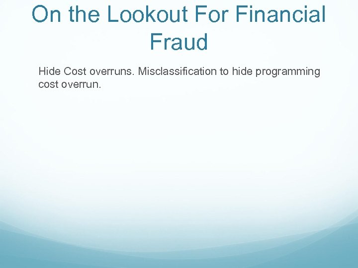 On the Lookout For Financial Fraud Hide Cost overruns. Misclassification to hide programming cost overrun.