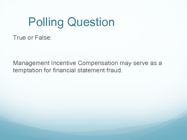 Polling Question True or False: Management Incentive Compensation may serve as a temptation for financial statement fraud.
