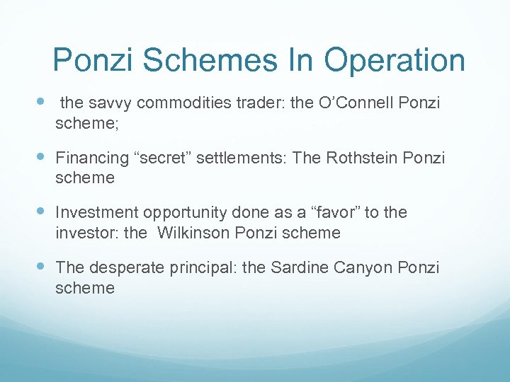Ponzi Schemes In Operation the savvy commodities trader: the O’Connell Ponzi scheme; Financing “secret” settlements: The Rothstein Ponzi scheme Investment opportunity done as a “favor” to the investor: the Wilkinson Ponzi scheme The desperate principal: the Sardine Canyon Ponzi scheme