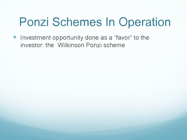 Ponzi Schemes In Operation Investment opportunity done as a “favor” to the investor: the Wilkinson Ponzi scheme