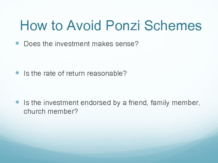How to Avoid Ponzi Schemes Does the investment makes sense? Is the rate of return reasonable? Is the investment endorsed by a friend, family member, church member?