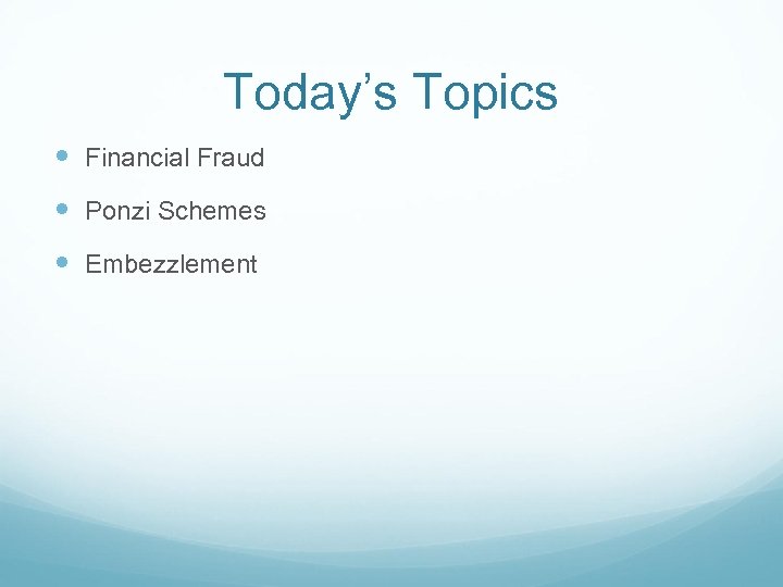 Today’s Topics Financial Fraud Ponzi Schemes Embezzlement