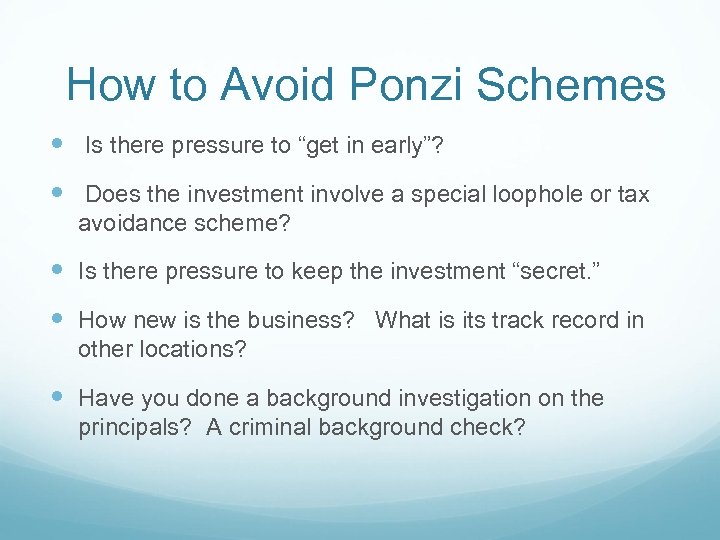How to Avoid Ponzi Schemes Is there pressure to “get in early”? Does the investment involve a special loophole or tax avoidance scheme? Is there pressure to keep the investment “secret. ” How new is the business? What is its track record in other locations? Have you done a background investigation on the principals? A criminal background check?