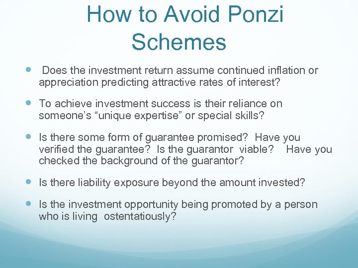 How to Avoid Ponzi Schemes Does the investment return assume continued inflation or appreciation predicting attractive rates of interest? To achieve investment success is their reliance on someone’s “unique expertise” or special skills? Is there some form of guarantee promised? Have you verified the guarantee? Is the guarantor viable? checked the background of the guarantor? Have you Is there liability exposure beyond the amount invested? Is the investment opportunity being promoted by a person who is living ostentatiously?