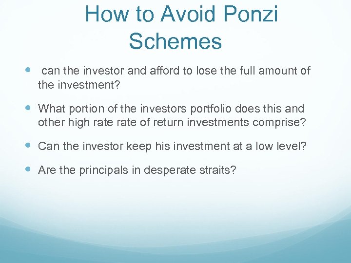 How to Avoid Ponzi Schemes can the investor and afford to lose the full amount of the investment? What portion of the investors portfolio does this and other high rate of return investments comprise? Can the investor keep his investment at a low level? Are the principals in desperate straits?