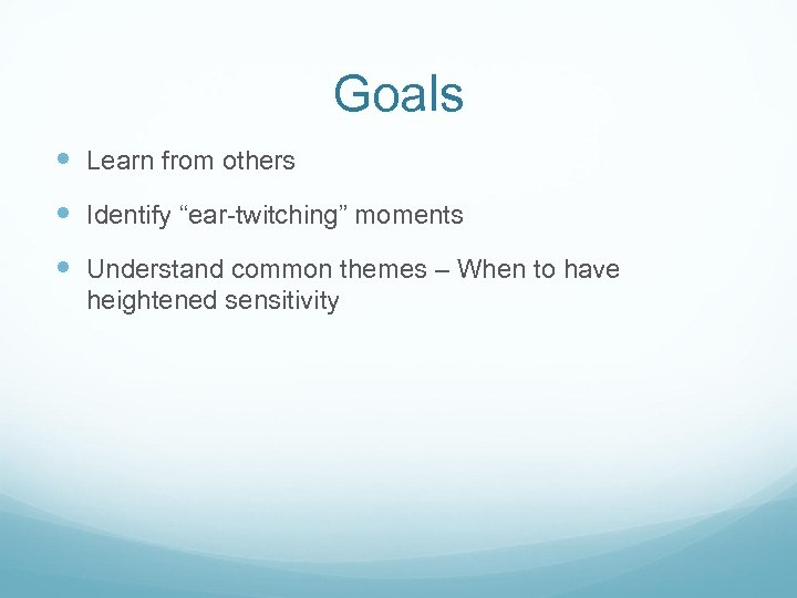 Goals Learn from others Identify “ear-twitching” moments Understand common themes – When to have heightened sensitivity