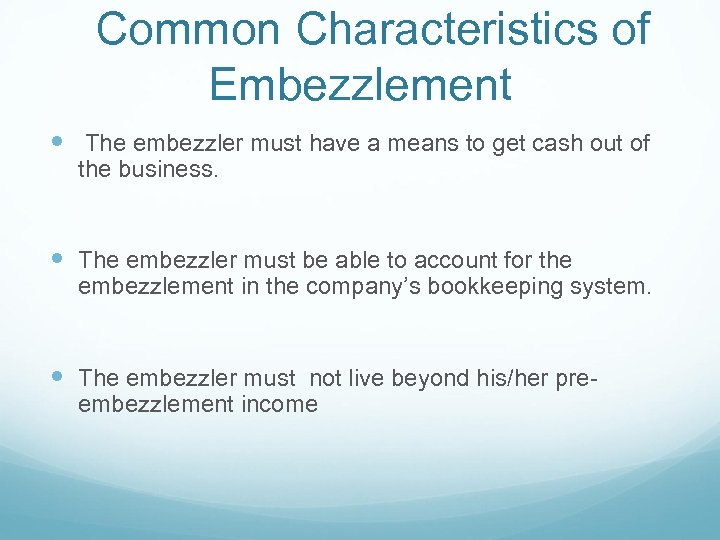 Common Characteristics of Embezzlement The embezzler must have a means to get cash out of the business. The embezzler must be able to account for the embezzlement in the company’s bookkeeping system. The embezzler must not live beyond his/her preembezzlement income