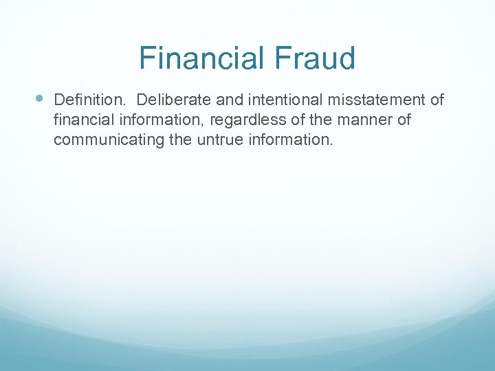 Financial Fraud Definition. Deliberate and intentional misstatement of financial information, regardless of the manner of communicating the untrue information.