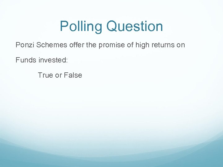 Polling Question Ponzi Schemes offer the promise of high returns on Funds invested: True or False