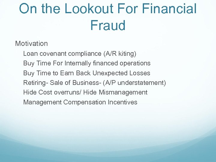 On the Lookout For Financial Fraud Motivation Loan covenant compliance (A/R kiting) Buy Time For Internally financed operations Buy Time to Earn Back Unexpected Losses Retiring- Sale of Business- (A/P understatement) Hide Cost overruns/ Hide Mismanagement Management Compensation Incentives