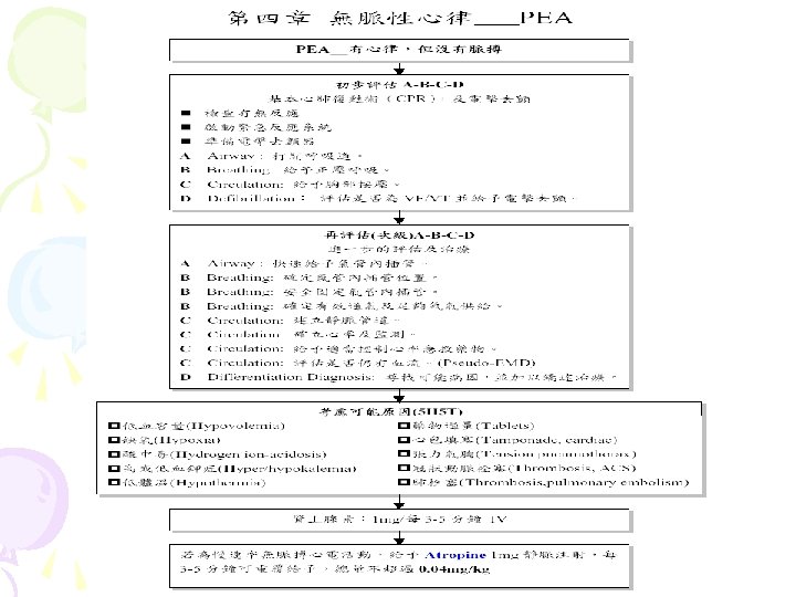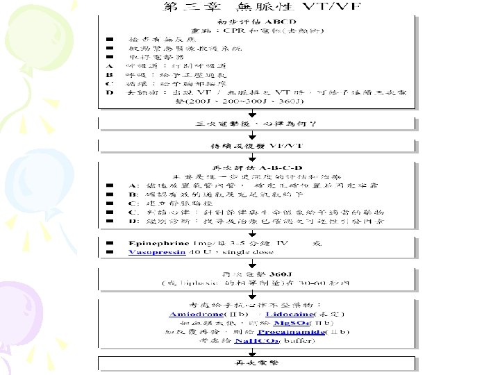 l無脈性VT/VF l無脈性心律___PEA l心跳停止無收縮__Asystole l心搏過慢 l心搏過速—總論 l. Atrial fibrillation or flutter l. Stable narrow-complex SVT l穩定型心搏過速 l. Wide complex tachycardia, type unknown, stable l同步心臟整流__ Synchronized Cardioversion l急性胸痛 l. Acute coronary syndrome l. Non-Q MI and Unstable Angina l急性肺水腫、低血壓、休克 l. Hypothermia l. Submersion Injuries l. Stroke