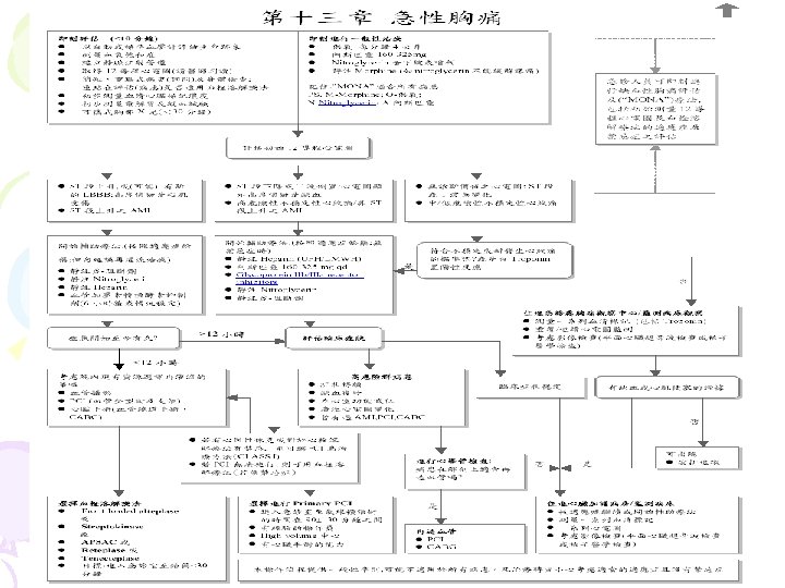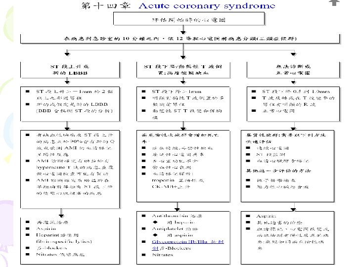 6. 急性冠狀動脈症候群: 到院前12 導程心電圖可以改善到院前的診斷,降低以醫院為基礎的治療時間。到 院前心電圖對於城市及郊區的到院前EMS 系統,都是有用且有效的。因此應該成 為所有ACLS 單位的標準配備(Class IIa)。 如果以下兩個時間總合超過60 分鐘,考慮到院前血栓溶解治療:(1)胸痛開 始時間到ACLS 人員與病患接觸,以及(2)由ACLS 人員到達病患身邊到抵 達醫院的時間 在歐洲,當以上的時間超過30 分鐘以上,就考慮到院前血栓溶解治療。此外, 如果急診處door-to-fibrinolytic interval 總是超過60 分鐘,到院前血栓溶解治療 應該效果較好。 對醫學中心及經驗豐富的心臟科而言,及冠狀動脈成型術可作為血栓溶解治療的取 代治療(Class I)。年齡小於 75 歲的心因性休克病患,需要轉送到心臟中心做冠狀 動脈成型術及主動脈內氣球幫浦的治療。但是唯有在door-to-balloon times 小於 90 分鐘時才有治療的好處(Class. I)。 抗血小板治療如glycoprotein IIb/IIIa inhibitors 對於非 Q 波心肌梗塞及高危險不穩定性心絞痛的病患,具有臨床的治療意義(Class IIa)。肝素 用做血栓溶解劑(如alteplase, reteplase)的輔助治療,其劑量目前建議減少到 60 U/kg( 最高 4000 U)靜脈快速注射以及每小時12 U/kg 的維持劑量。劑量的減少有助於減少顱內 出血的機會。 所有急性心肌梗塞病患,包括非Q 波心肌梗塞,只要沒有禁忌,都需要Aspirin 及β-blockers(Class I)。病患若有大範圍前壁心肌梗塞,左心室功能異常,以 及心搏出率小於百分之四十,只要沒有低血壓,需要早期給予angiotensin-converting enzyme inhibition 。