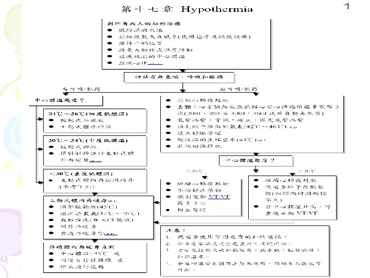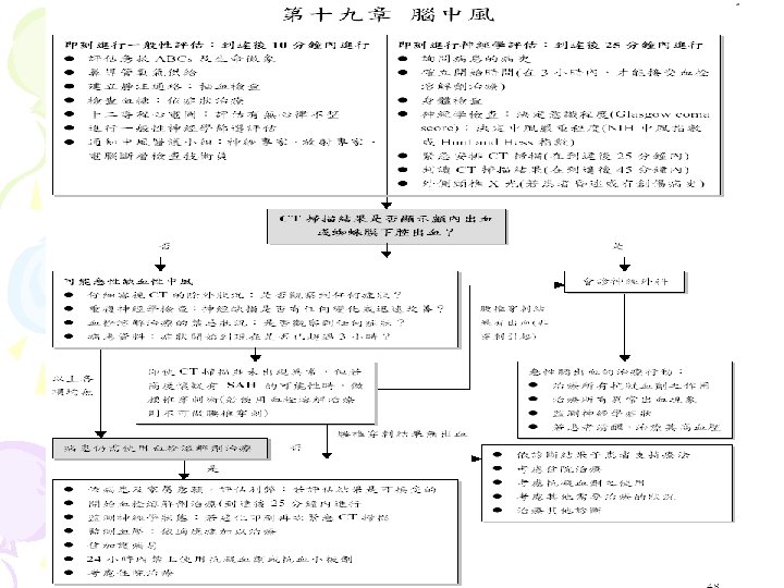 7. 中風: 靜脈注射recombinant tissue plasminogen activator(rt. PA)對於中風發作 3 小時內且 符合血栓溶解治療標準的病患,可以改善神經學癒後。中風 3 小時內的病患需要緊 急檢傷分類。其緊急度與急性心肌梗塞相同。 EMS 系統應該建議一個院前中風評估表,以便能快速找出對血栓溶解治療有效的病 患。這種評估與對胸痛病患的評估類似(Class IIb)。凡是有可能接受血栓溶解治療 的病患,應該迅速轉送到 24 小時都可以做電腦斷層的醫療院所(Class IIb)。 8. 急救後的照顧: 心臟停止後,對於有輕度低體溫的病患,不可以主動加溫(Class IIb)。對於心臟停 止的病患主動給予降低體溫的治療,目前仍在研究中(Class Indeterminate)。對於發 燒的病患予以治療,保持正常的體溫(Class IIa)。 心臟停止後,病患若需要機械性通氣,通氣值應該維持在正常範圍內(Class IIa)。 過度換氣可能有害,應予避免(Class III)。唯一的例外是對急救後表現出cerebral herniation 的病患給予過度換氣。.