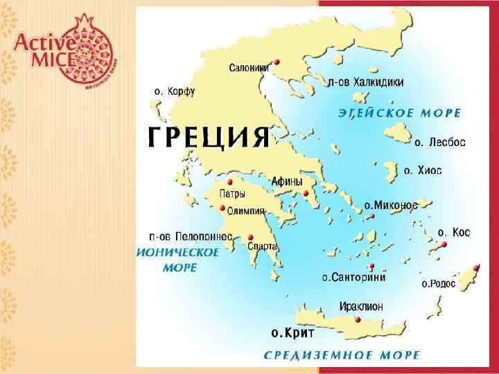 О Греции Греция – настоящий рай с развитой туристической инфраструктурой, страна, наделенная мягким климатом, удивительной красотой природы, восхитительными ландшафтами, включающими кристально чистые моря, зеленые горы и прекрасные пляжи. Греция (Эллас или Эллада), официально - Греческая Республика, расположена на юго-востоке Европы, в южной оконечности Балканского полуострова, в Восточном Средиземноморье. Столица Греции – легендарный город Афины. Греция занимает 11 -е место среди стран с самой протяженной береговой линией (13. 676 км). В состав государства входят более 2. 500 островов, большинство из которых необитаемы. Важное место в греческой экономике занимает туризм. В 2007 году Греция приняла около 20 миллионов туристов и вошла в десятку лучших туристических направлений мира. Одними из самых популярных туристических курортов Греции являются Ионические острова, в том числе Корфу и Закинф, остров Крит, Афинская Ривьера, п-ов Халкидики и Пелопоннес, регион Пиерия, а также Родос, Миконос, Санторини, Тасос, Самос, Эвбея (Эвия) и Хиос. Эллада неслучайно считается колыбелью европейской культуры, здесь был заложен фундамент мировой культуры, зародились демократия и философия, науки и искусство, сыгравшие величайшую роль в истории всего человечества и оказавшие огромное влияние на три континента. Кроме того, Греция является родиной Олимпийских игр, драмы, трагедии и комедии.