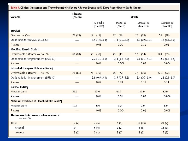 Treatment RCT: r. FVIIa in intracranial hemorrhage n Intervention n Patients randomized to 40 mcg/kg r. FVIIa, 80 mcg/kg r. FVIIa, 160 mcg/kg r. FVIIa or placebo Dose was given within 1 hour of CT scan and no more than 4 hours after symptom onset Endpoints n n Hematoma size by head CT at 24 hours and 72 hours Clinical Assessment n n n Glasgow Coma Scale Rankin Scale: global outcomes National Institutes of Health Stroke Scale: neurologic impairment Barthel Index: activities of daily living Extended Glasgow Outcomes Scale: ability for self-care and independence Mayer SA, et al. Recombinant activated factor VII for acute intracerebral hemorrhage. NEJM 2005; 352(8): 777 -785.