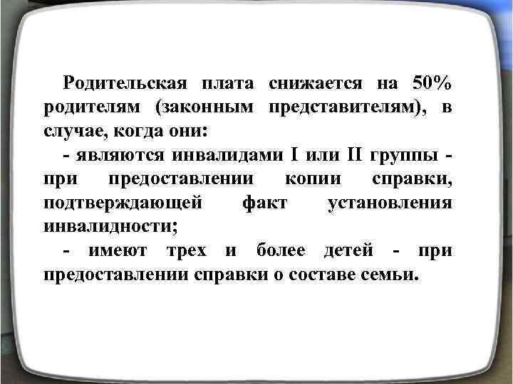 Родительская плата снижается на 50% родителям (законным представителям), в случае, когда они: - являются инвалидами I или II группы - при предоставлении копии справки, подтверждающей факт установления инвалидности; - имеют трех и более детей - при предоставлении справки о составе семьи.