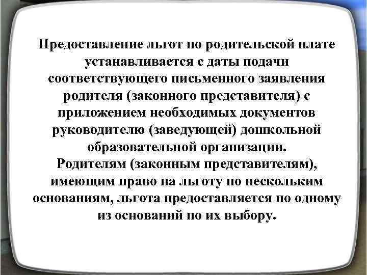 Предоставление льгот по родительской плате устанавливается с даты подачи соответствующего письменного заявления родителя (законного представителя) с приложением необходимых документов руководителю (заведующей) дошкольной образовательной организации. Родителям (законным представителям), имеющим право на льготу по нескольким основаниям, льгота предоставляется по одному из оснований по их выбору.
