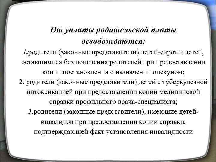 От уплаты родительской платы освобождаются: 1. родители (законные представители) детей-сирот и детей, оставшимися без попечения родителей при предоставлении копии постановления о назначении опекуном; 2. родители (законные представители) детей с туберкулезной интоксикацией при предоставлении копии медицинской справки профильного врача-специалиста; 3. родители (законные представители), имеющие детейинвалидов при предоставлении копии справки, подтверждающей факт установления инвалидности