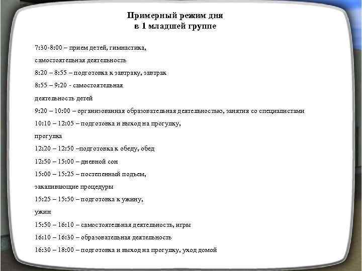 Примерный режим дня в 1 младшей группе 7: 30 -8: 00 – прием детей, гимнастика, самостоятельная деятельность 8: 20 – 8: 55 – подготовка к завтраку, завтрак 8: 55 – 9: 20 - самостоятельная деятельность детей 9: 20 – 10: 00 – организованная образовательная деятельностью, занятия со специалистами 10: 10 – 12: 05 – подготовка и выход на прогулку, прогулка 12: 20 – 12: 50 –подготовка к обеду, обед 12: 50 – 15: 00 – дневной сон 15: 00 – 15: 25 – постепенный подъем, закаливающие процедуры 15: 25 – 15: 50 – подготовка к ужину, ужин 15: 50 – 16: 10 – самостоятельная деятельность, игры 16: 10 – 16: 30 – образовательная деятельность 16: 30 – 18: 00 – подготовка и выход на прогулку, уход домой