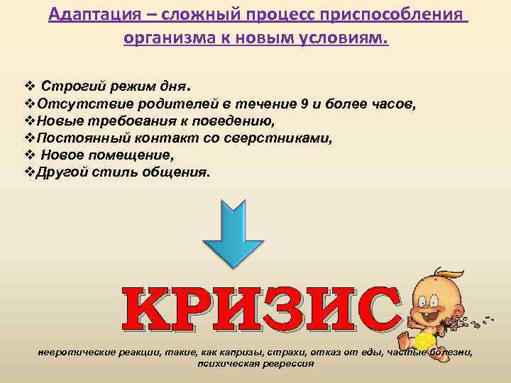 Адаптация – сложный процесс приспособления организма к новым условиям. v Строгий режим дня. v. Отсутствие родителей в течение 9 и более часов, v. Новые требования к поведению, v. Постоянный контакт со сверстниками, v Новое помещение, v. Другой стиль общения. КРИЗИС невротические реакции, такие, как капризы, страхи, отказ от еды, частые болезни, психическая регрессия