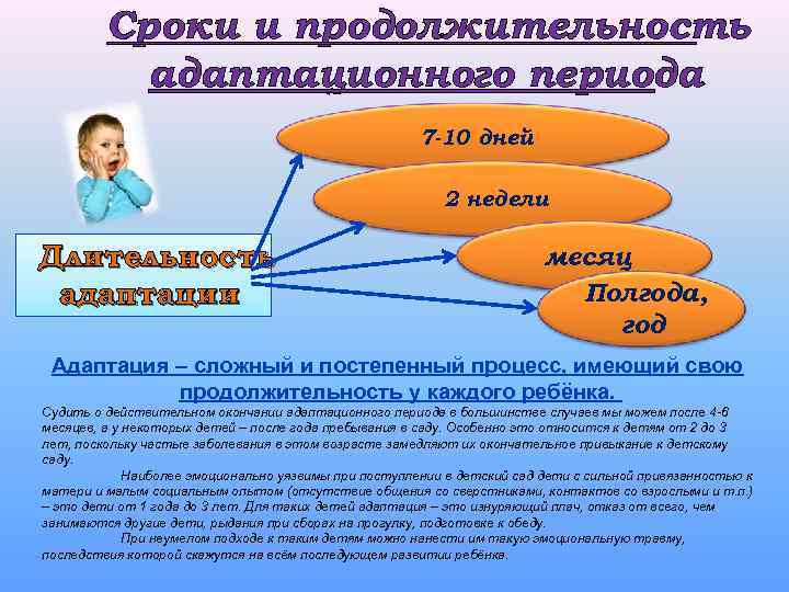 Сроки и продолжительность адаптационного периода 7 -10 дней 2 недели Длительность адаптации месяц Полгода, год Адаптация – сложный и постепенный процесс, имеющий свою продолжительность у каждого ребёнка. Судить о действительном окончании адаптационного периода в большинстве случаев мы можем после 4 -6 месяцев, а у некоторых детей – после года пребывания в саду. Особенно это относится к детям от 2 до 3 лет, поскольку частые заболевания в этом возрасте замедляют их окончательное привыкание к детскому саду. Наиболее эмоционально уязвимы при поступлении в детский сад дети с сильной привязанностью к матери и малым социальным опытом (отсутствие общения со сверстниками, контактов со взрослыми и т. п. ) – это дети от 1 года до 3 лет. Для таких детей адаптация – это изнуряющий плач, отказ от всего, чем занимаются другие дети, рыдания при сборах на прогулку, подготовке к обеду. При неумелом подходе к таким детям можно нанести им такую эмоциональную травму, последствия которой скажутся на всём последующем развитии ребёнка.