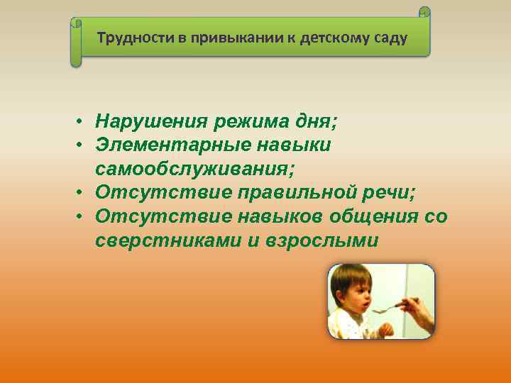 Трудности в привыкании к детскому саду • Нарушения режима дня; • Элементарные навыки самообслуживания; • Отсутствие правильной речи; • Отсутствие навыков общения со сверстниками и взрослыми