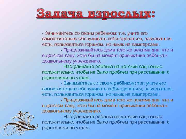 Задача взрослых: - Занимайтесь со своим ребёнком: т. е. учите его самостоятельно обслуживать себя-одеваться, раздеваться, есть, пользоваться горшком, но никак не памперсами. - Придерживайтесь дома того же режима дня, что и в детском саду, хотя бы на момент привыкания ребёнка к дошкольному учреждению. - Настраивайте ребёнка на детский сад только положительно, чтобы не было проблем при расставании с родителями по утрам.