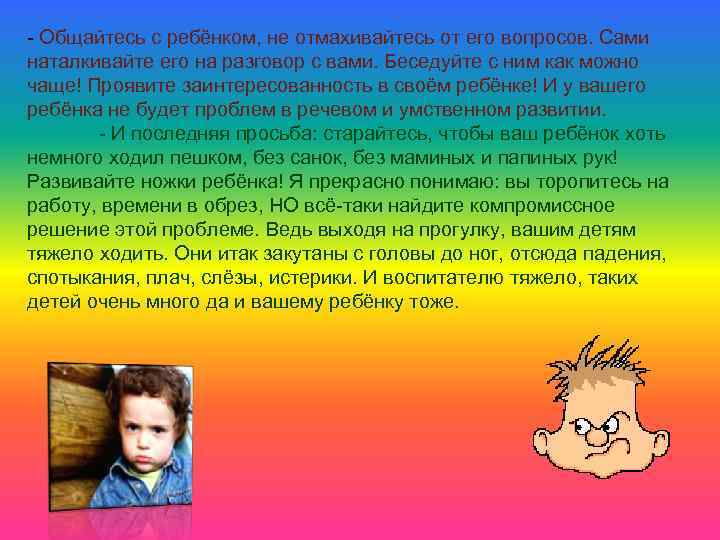 - Общайтесь с ребёнком, не отмахивайтесь от его вопросов. Сами наталкивайте его на разговор с вами. Беседуйте с ним как можно чаще! Проявите заинтересованность в своём ребёнке! И у вашего ребёнка не будет проблем в речевом и умственном развитии. - И последняя просьба: старайтесь, чтобы ваш ребёнок хоть немного ходил пешком, без санок, без маминых и папиных рук! Развивайте ножки ребёнка! Я прекрасно понимаю: вы торопитесь на работу, времени в обрез, НО всё-таки найдите компромиссное решение этой проблеме. Ведь выходя на прогулку, вашим детям тяжело ходить. Они итак закутаны с головы до ног, отсюда падения, спотыкания, плач, слёзы, истерики. И воспитателю тяжело, таких детей очень много да и вашему ребёнку тоже.