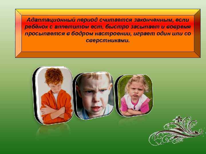 Адаптационный период считается законченным, если ребёнок с аппетитом ест, быстро засыпает и вовремя просыпается в бодром настроении, играет один или со сверстниками.
