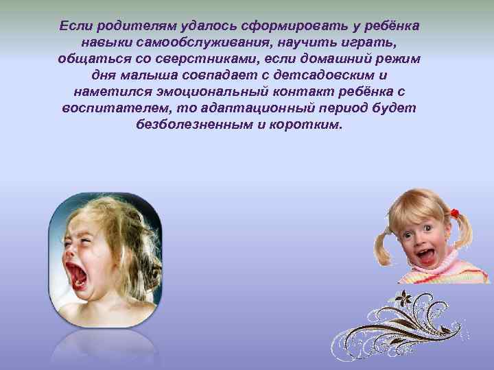 Если родителям удалось сформировать у ребёнка навыки самообслуживания, научить играть, общаться со сверстниками, если домашний режим дня малыша совпадает с детсадовским и наметился эмоциональный контакт ребёнка с воспитателем, то адаптационный период будет безболезненным и коротким.