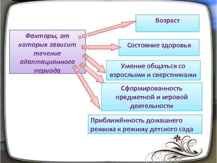 Возраст Факторы, от которых зависит течение адаптационного периода Состояние здоровья Умение общаться со взрослыми и сверстниками Сформированность предметной и игровой деятельности Приближённость домашнего режима к режиму детского сада