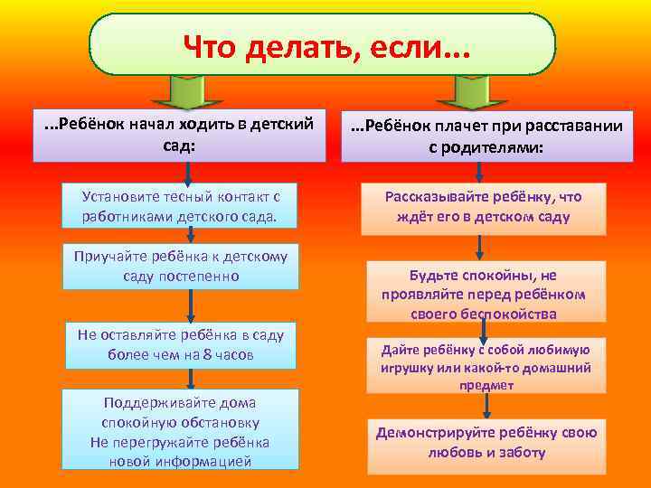 Что делать, если. . . Ребёнок начал ходить в детский сад: . . . Ребёнок плачет при расставании с родителями: Установите тесный контакт с работниками детского сада. Рассказывайте ребёнку, что ждёт его в детском саду Приучайте ребёнка к детскому саду постепенно Не оставляйте ребёнка в саду более чем на 8 часов Поддерживайте дома спокойную обстановку Не перегружайте ребёнка новой информацией Будьте спокойны, не проявляйте перед ребёнком своего беспокойства Дайте ребёнку с собой любимую игрушку или какой-то домашний предмет Демонстрируйте ребёнку свою любовь и заботу