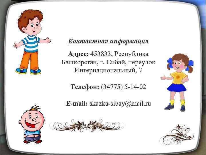 Контактная информация Адрес: 453833, Республика Башкорстан, г. Сибай, переулок Интернациональный, 7 Телефон: (34775) 5 -14 -02 E-mail: skazka-sibay@mail. ru