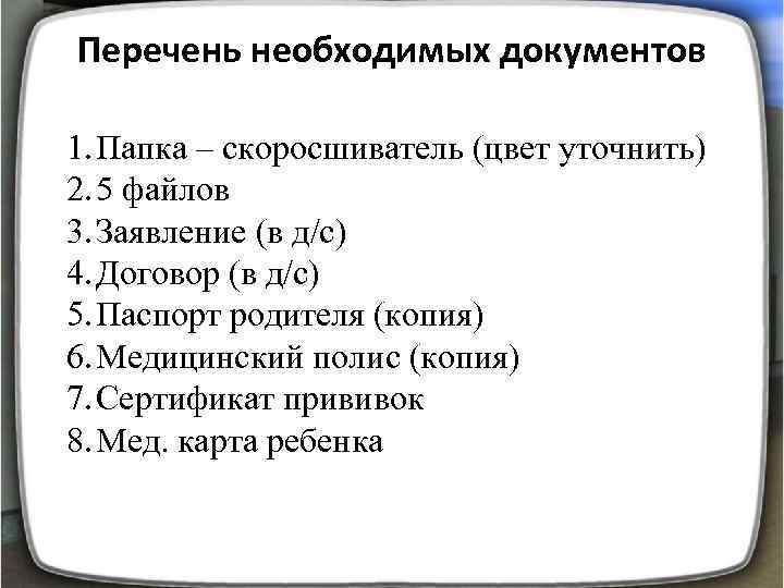 Перечень необходимых документов 1. Папка – скоросшиватель (цвет уточнить) 2. 5 файлов 3. Заявление (в д/с) 4. Договор (в д/с) 5. Паспорт родителя (копия) 6. Медицинский полис (копия) 7. Сертификат прививок 8. Мед. карта ребенка