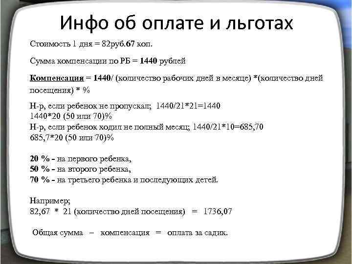 Инфо об оплате и льготах Стоимость 1 дня = 82 руб. 67 коп. Сумма компенсации по РБ = 1440 рублей Компенсация = 1440/ (количество рабочих дней в месяце) *(количество дней посещения) * % Н-р, если ребенок не пропускал; 1440/21*21=1440 1440*20 (50 или 70)% Н-р, если ребенок ходил не полный месяц; 1440/21*10=685, 70 685, 7*20 (50 или 70)% 20 % - на первого ребенка, 50 % - на второго ребенка, 70 % - на третьего ребенка и последующих детей. Например; 82, 67 * 21 (количество дней посещения) = 1736, 07 Общая сумма – компенсация = оплата за садик.