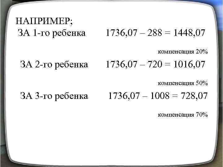НАПРИМЕР; ЗА 1 -го ребенка 1736, 07 – 288 = 1448, 07 компенсация 20% ЗА 2 -го ребенка 1736, 07 – 720 = 1016, 07 компенсация 50% ЗА 3 -го ребенка 1736, 07 – 1008 = 728, 07 компенсация 70%
