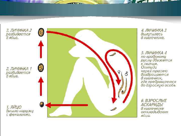 Аскаридоз Заболевание, вызванное аскаридами. Средняя заболеваемость населения Земли составляет около 100 млн. случаев в год. Основной механизм заражения - фекальнооральный, через заглатывание яиц с немытыми овощами и фруктами, а также с другой пищей (через немытые руки). Обсеменению пищевых продуктов в определенной степени также способствуют мухи.