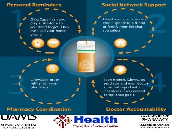 Glow. Caps www. glowcaps. com • Cellular (AT&T) • Caps communicate with base to track adherence • Progressive reminders 1. 2. 3. 4. 5. 6. Light up (cap) Light up (base) Play ringtone Call/text patient Requests Rx refills Weekly adherence report