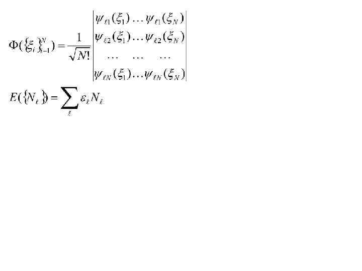 - Одноэлектронный Гамильтониан (Гамильтониан одного отдельно взятого электрона в тех же силовых полях, что и весь газ) 1) Находим одноэлектронные стационарные состояния – состояния одного отдельно взятого электрона, рассмотренного в тех же силовых полях, что и весь газ - Одноэлектронный спектр и базис из в. ф. одноэлектронных стационарных состояний 2) В стационарном состоянии всей системы в целом каждый из электронов находится в одном из одночастичных стационарных состояний. Поэтому стационарное состояние всего газа в целом однозначным образом задается указанием чисел заполнения всех одночастичных стационарных состояний Электроны – фермионы => подчиняются принципу запрета Паули => числа заполнения могут принимать только два значения