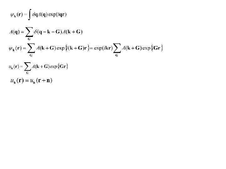 Надо: одноэлектронные стационарные состояния для случая, когда все атомы находятся в положении равновесия (хорошая нулевая задача) Идеальный кристалл => поле ионов – периодическое с периодом решетки Электронейтральность => средняя электронная плотность имеет период решетки => самосогласованное поле – периодическое с периодом решетки Кристаллическое поле – периодическое с периодом решетки