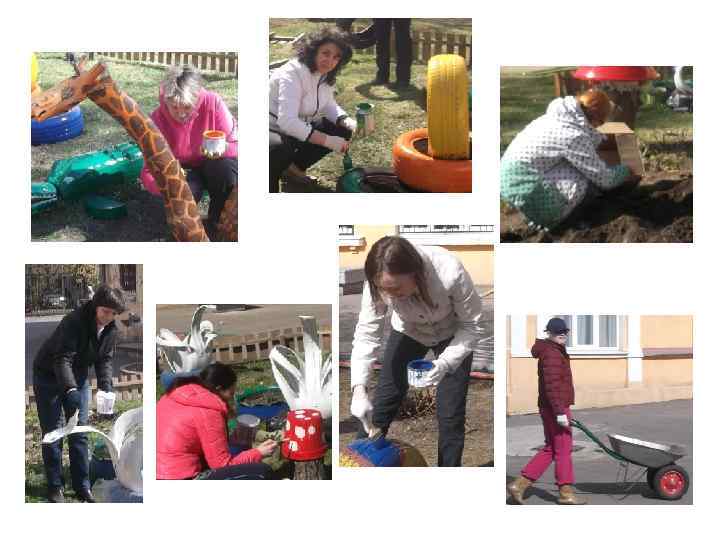 Объем выполненных работ: Покраска игрового оборудования и сказочных персонажей на участке, установка ограды в огороде, наполнение цветников землей, посадка георгинов , изготовление клумбы «Солнышко» , изготовление нового персонажа «Черепашка» , ремонт мебели в раздевалке группы, ремонт дверей в туалете, изготовление крышки для песочницы.