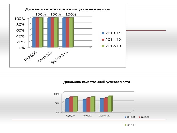 Примеры представления материалов 2010 -2011 Административные контр. 2011 -2012 работы 2012 -2013 2010 -2011 Администра 2011 -2012 тивные контр. работы 2012 -2013 % участия учащихся Сроки проведения Результаты проверки класс Виды контроля Учебные годы Динамика абсолютной и качественной успеваемости за три года в трёх классах Кол- во учащихся 7 а 25 100 % Справи- лись без « 2» (%) 100 % 8 а 27 100 % 100% 9 а 27 100% 72% 79% 8 б 21 95 % 100 % 63 % 9 б 23 96 % 100 % 73 % 10 б 29 93% 100% 79% 9 а 24 96 % 100 % 71 % 10 а 29 100 % 72 % 11 а 28 100% 82 % В т. ч. на « 4» и « 5» (%) 67 %