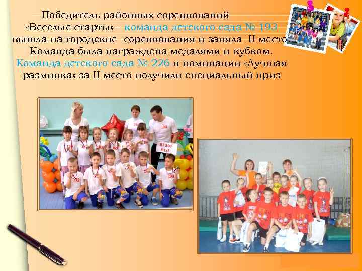 Победитель районных соревнований «Веселые старты» - команда детского сада № 193 вышла на городские соревнования и заняла II место. Команда была награждена медалями и кубком. Команда детского сада № 226 в номинации «Лучшая разминка» за II место получили специальный приз www. themegallery. com