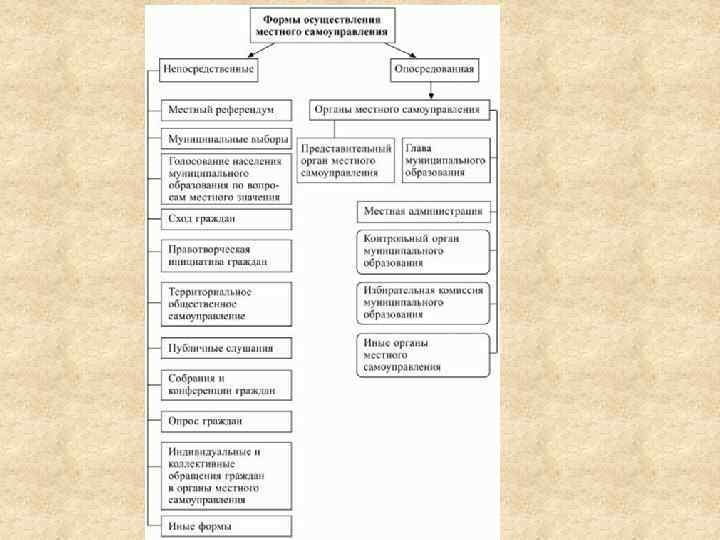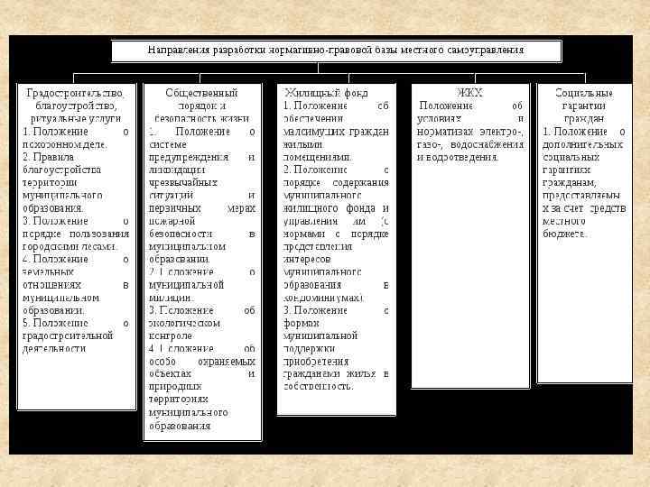 Местная власть формируется в государстве для решения трех основных задач. 1. Предоставление основных социальных услуг: обеспечение населения жильем, благоустройство территории, предоставление коммунальных услуг, услуг местного транспорта и связи, создание условий для получения основного общего образования, необходимой медицинской помощи, торгового, бытового, культурного обслуживания населения. 2. Привлечение местных ресурсов (природных, человеческих, географических и других, присущих только данному микротерриториальному уровню). 3. Обеспечение непосредственного взаимодействия с населением с целью вовлечения граждан в процесс решения вопросов местного и общегосударственного значения (публичных дел). 10